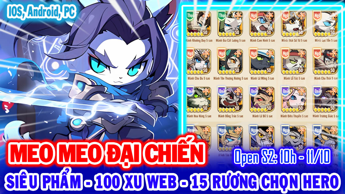MEO MEO ĐẠI CHIẾN Open S2 10h 11/10 (Android,IOS) 👉 Hỗ Trợ Bản Hot - Free 100 Xu Web - KNB - Vip - 15 Rương Chọn Hero - Rương Chọn...